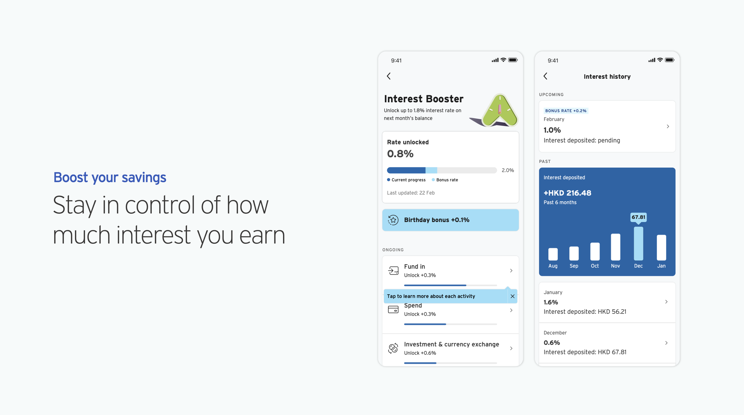 The most ambitious aspect of Interest Booster is its real-time interest tracker, which no other bank with similar products has been able to do. To make it a reality, significant coordination was required to unify 5 business lines. This was challenging for me both as a designer (keeping the UI informative yet simple) and as a product manager (reconciling competing KPIs and data practices of different businesses).